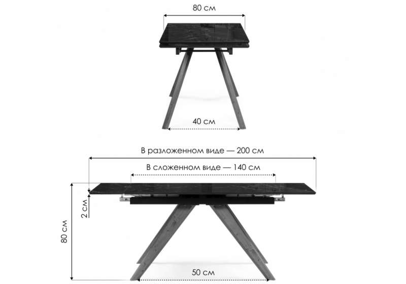 Расстояние между ножками: 50 х 40 см. Толщина столешницы: 2 см.