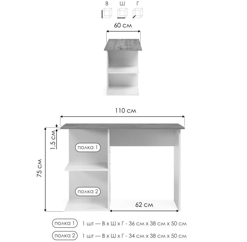 Расстояние между ножками: 62 см. Размер верхней полки (ШхГхВ): 38 х 50 х 34 см. Размер нижней полки (ШхГхВ): 38 х 50 х 36 см. Толщина столешница: 1,5 см.